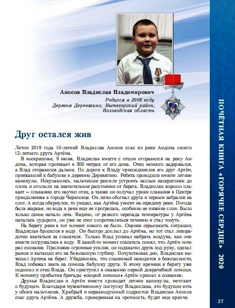 По итогам рассмотрения 973 представлений на награждение, поступивших в Оргкомитет в 2019 году, в Почётную книгу «Горячее сердце» 2020 года включены 156 историй, рассказывающих о 185 лауреатах. Одна из историй о нашем земляке, ученике МБОУ «Андомская СОШ», Владиславе Аносове. Мы поздравляем Влада с заслуженной наградой, желаем крепкого здоровья, успехов в учебе, приумножения добрых дел!