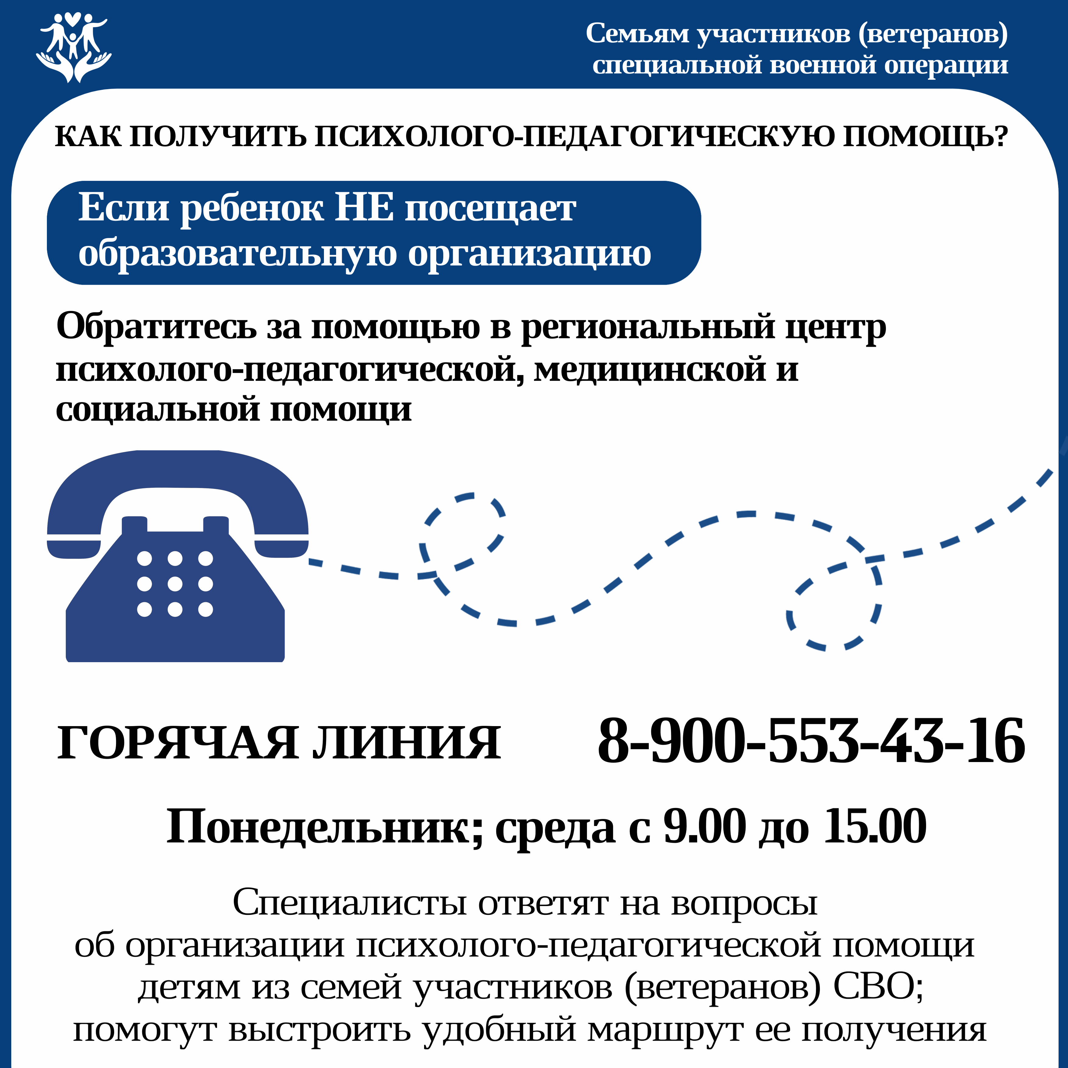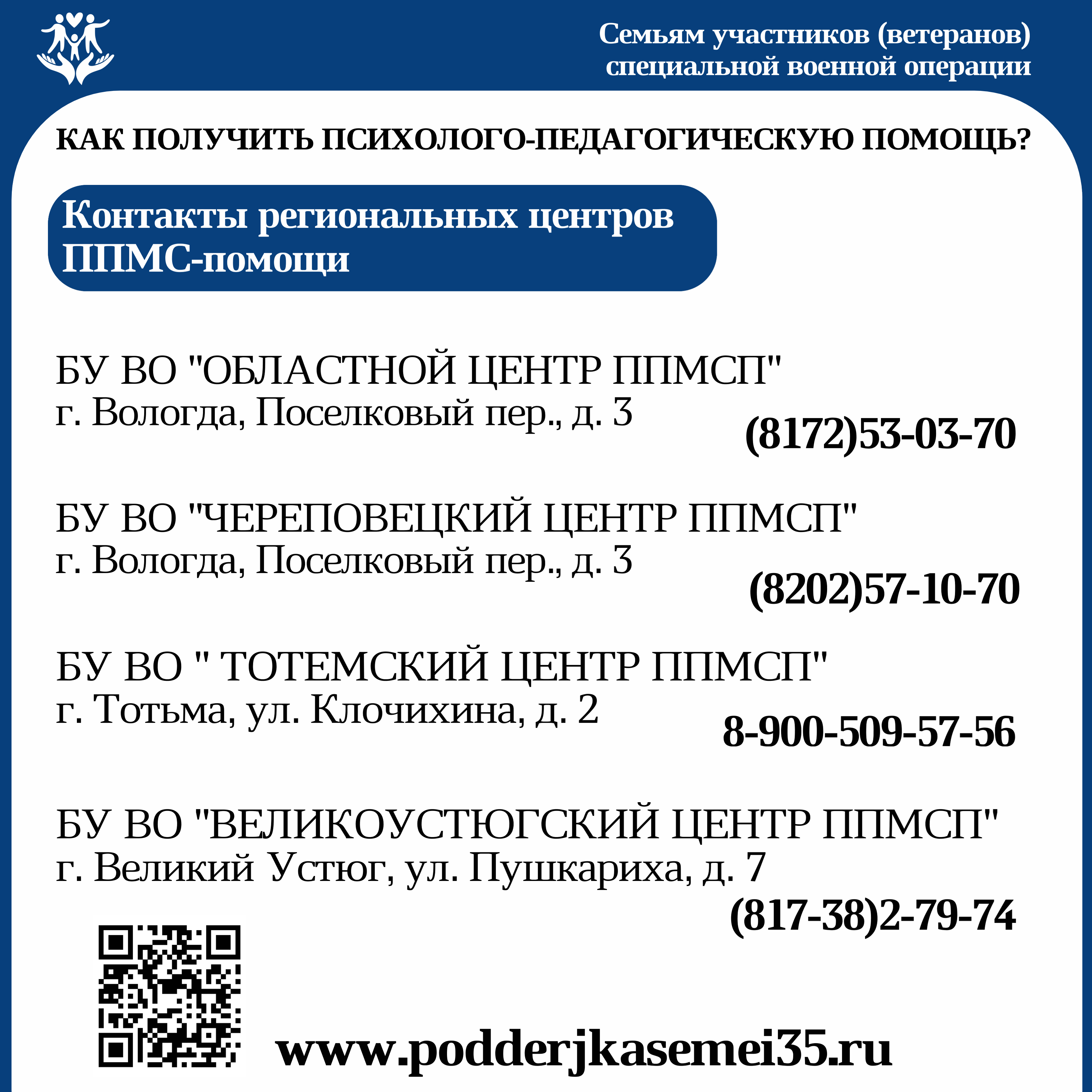 В рамках нацпроекта «Образование» родители и выпускники могут бесплатно получить консультацию психолога на всех консультативных площадках образовательных организаций Вологодской области в удобном формате. Записаться на консультацию можно на сайте или по телефонам региональных центров психолого-педагогической, медицинской и социальной помощи: (8172) 53-03-70 (Вологда), (8202) 57-10-70 (Череповец), 8-900-509-57-56 (Тотьма) и (81738) 2-79-74 (Великий Устюг).